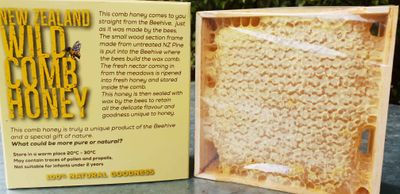 This Comb Honey comes to you straight from the Beehive, just as it was made by the Bees. The small wood section frame made from untreated NZ Pine is put into the Beehive where the Bees build the Wax Comb. The fresh Nectar coming in from the Meadows is ripened into fresh Honey and stored inside the Comb. The Honey is then sealed with wax by the Bees to retain all the delicate flavour unique to Honey. This Comb Honey is truly a unique product of the Beehive and a special gift of nature.